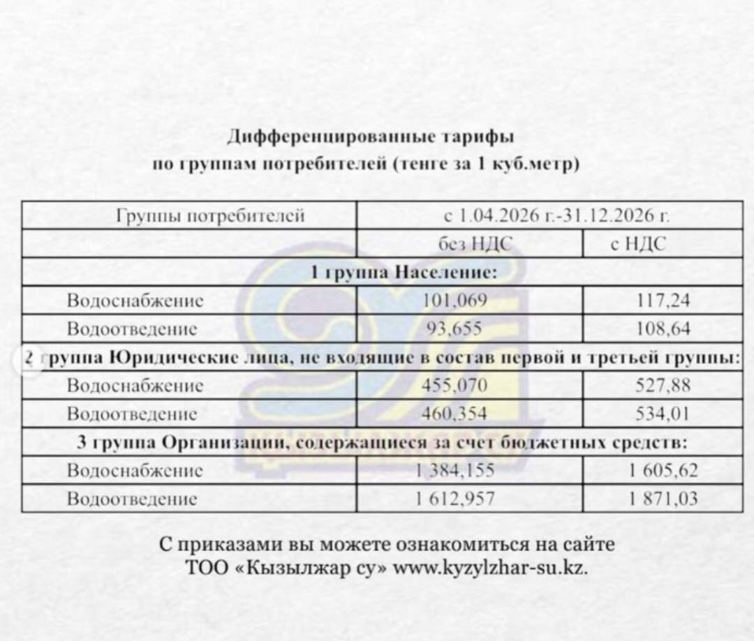 Для жителей города всё остаётся без перемен — суммы в квитанциях не изменятся. Стоимость одного кубометра воды сохраняется на уровне 117,24 тенге с учётом НДС, а за услуги канализации по-прежнему нужно будет платить 108,64 тенге.