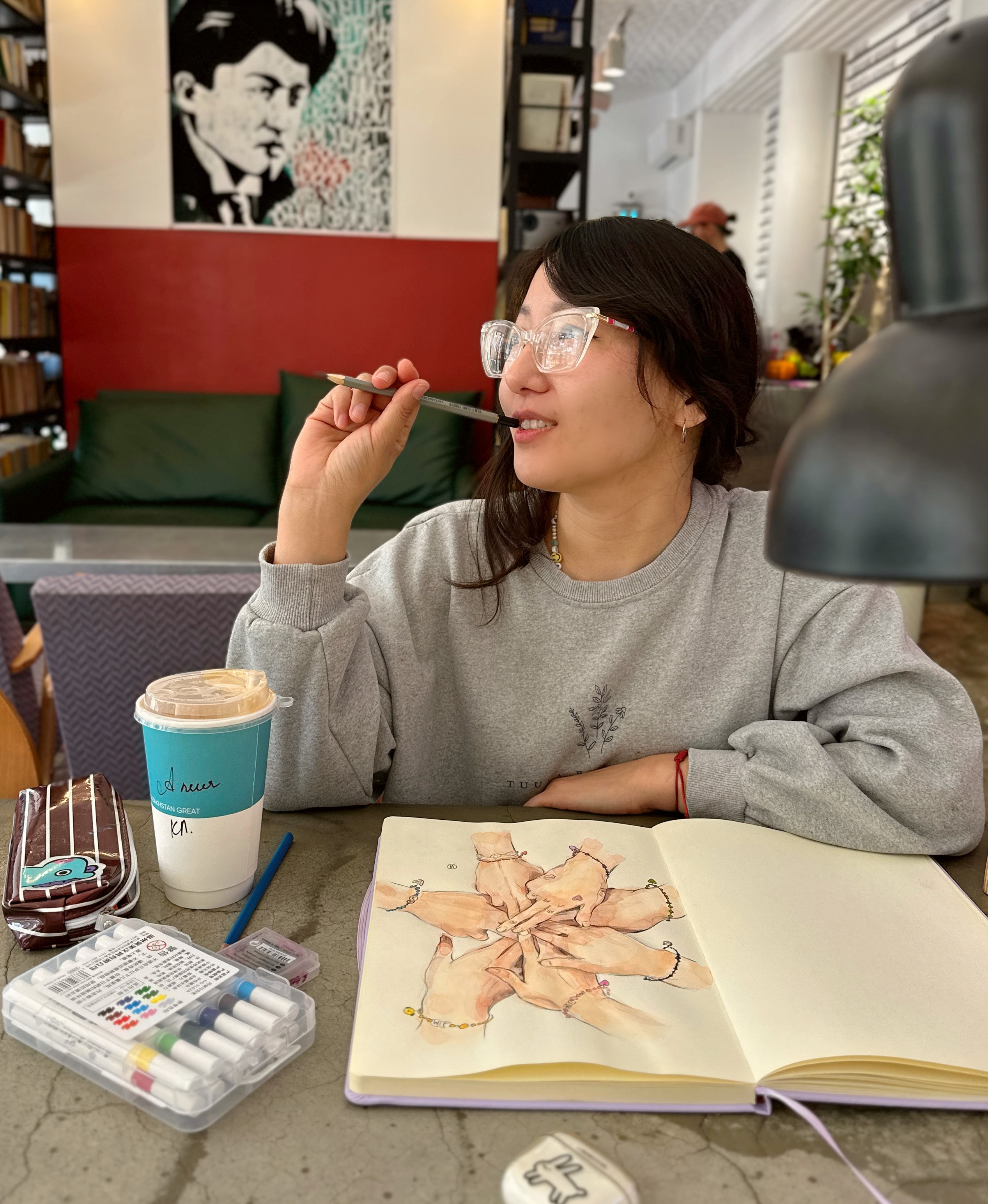 «Недавно я была в Сеуле и наконец попала в магазин, который долгое время стоял у меня на заставке телефона. Своими глазами увидела, как там всё устроено, прочувствовала эту атмосферу, и это ещё больше зажгло во мне желание создать что-то подобное в Петропавловске. Сейчас меня особенно вдохновляют выступления BTS - их энергия, визуал, образы. Я могу бесконечно пересматривать их шоу и ловить идеи для новых работ. Недавно, 11 апреля, я исполнила свою мечту и побывала на их концерте в Корее! Теперь в моей голове - бесконечное количество идей. Для меня это очень сильный источник вдохновения: мне важно быть в этом потоке, проживать эти эмоции и передавать их через свои рисунки», - делится художница.