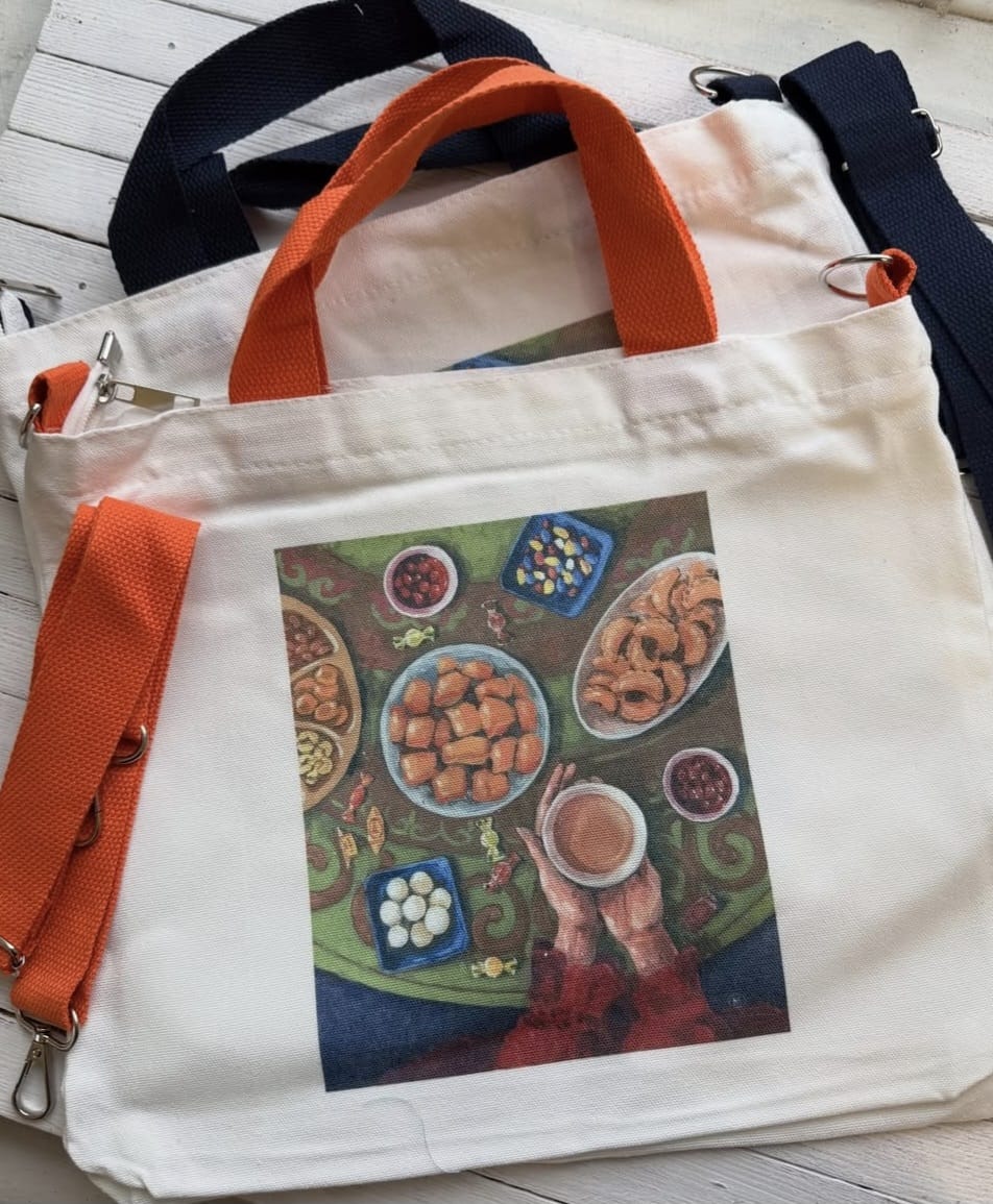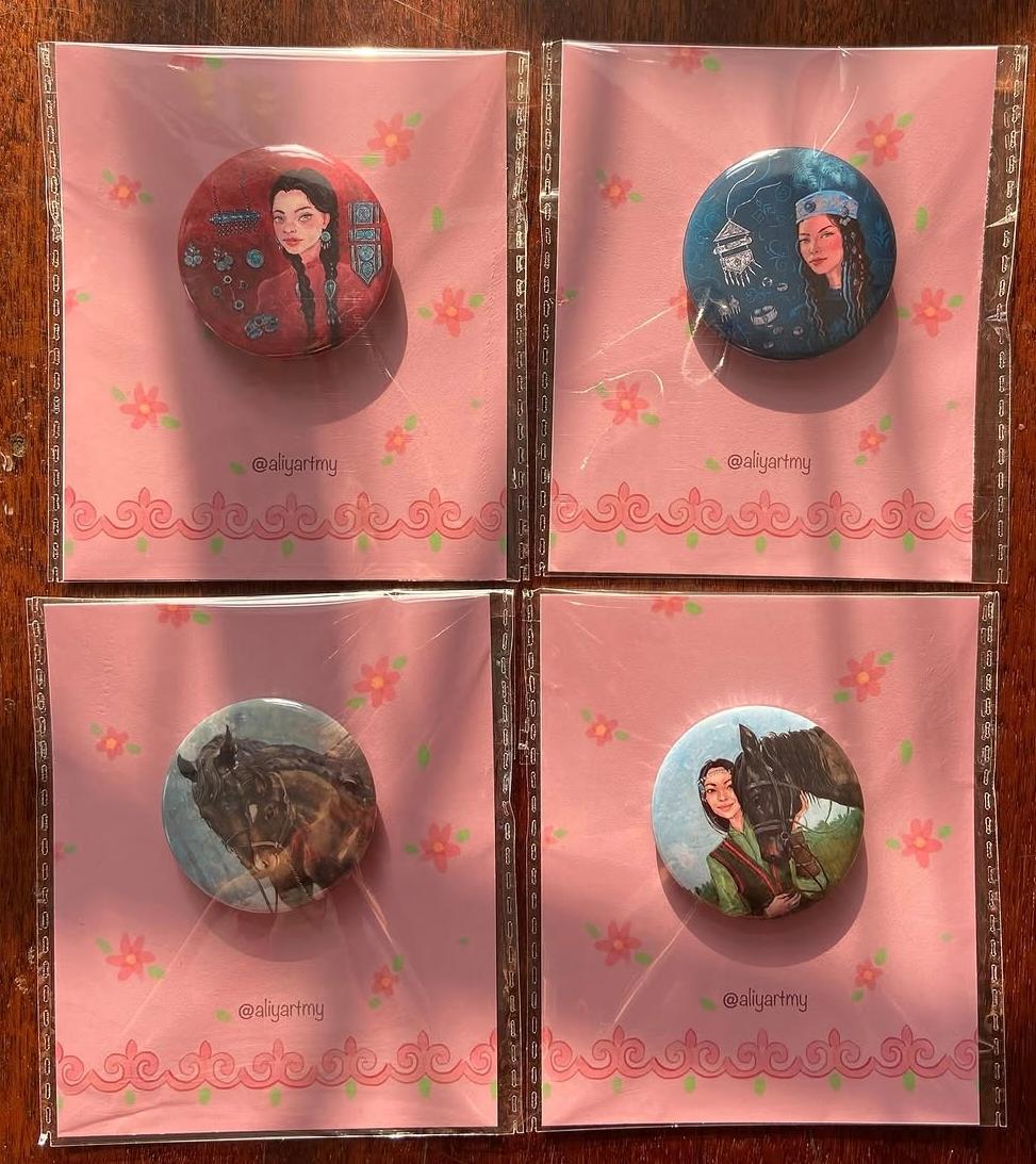 На странице Алии в социальных сетях целая галерея ярких образов: от классических портретов до колоритных сюжетов. Помимо картин, в коллекции художницы можно найти авторские шопперы, где оживают сцены с казахским дастарханом, грациозными лошадьми и девушками в национальных нарядах. Помимо сумок, Алия создает значки и скетчбуки, а особую гордость вызывает календарь на казахском языке, каждая страница которого украшена её личными иллюстрациями.